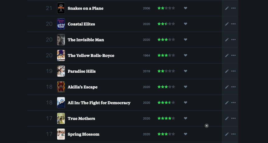 Man…finally saw “Snakes on a Plane”...bananas…“The Invisible Man” was so predictable and disappointing…I watched “Paradise Hills” because I liked French actor Arnaud Valois in “Spring Blossom”…but this movie was not good (Emma Roberts always does weird shit)…Everyone should watch “All In: The Fight for Democracy” but it will make you mad!…“True Mothers”was beautiful and heartbreaking…the director of “Spring Blossom,” at only 20 years old, Suzanne Lindon has so much potential, keep her on your radar.