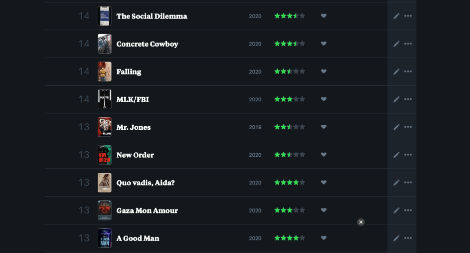 Everyone should check out “The Social Dilemma” just so you can be really cognizant of the consequences of our social media usage…“Concrete Cowboy” was a little disappointing…as was “Falling” and “Mr. Jones”...nothing new to see in “MLK/FBI”…although getting a lot of critical praise, “New Order”just didn’t do it for me but I’ve been told if you’re more familiar with Latin American political history, you’ll understand it more…“Quo Vadis, Aida?” is one of the best films I’ve seen all year — have the tissues ready…same with “A Good Man” (interview with Soko and Noémie Merlant coming soon)…“Gaza Mon Amour”was a cute love story