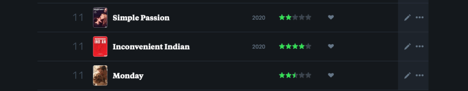 “Simple Passion” was unwatchable and boring to me (it stars the “bad boy of ballet” Sergei Polunin)…“Inconvenient Indian” is a MUST WATCH for everyone…“Monday” left me a little disappointed (and I love me some Sebastian Stan…but this wasn’t it)