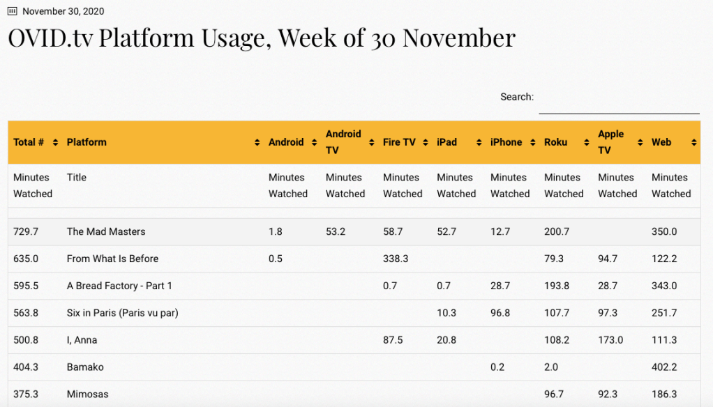 This is right up my alley! They’ve also said that they will be giving folks a peek behind the curtain and opening the books to share with audiences, filmmakers and distribution partners the real number and metric and dollars and cents of the business — this means a lot for indie filmmakers in particular! This is like Criterion Channel (with their blog, behind the scenes commentary and interviews) and Seed & Spark (making the distribution game — and numbers — more transparent for filmmakers) had a baby — and I’m here for it! Unlike the other big name streamers, OVID.tv will make their subscriber numbers and trends (anonymous but accurate), viewership and usage data for all the films on the streamer available.