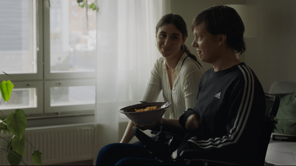 Jimmy: Well, I knew I wanted to work with Madeleine Martin (Ida, the assistant) because I knew her from before. So I called her up and asked her if she wanted to be a part of it. I didn’t need to audition her because I know she’s a strong actress. Then me and the producer spoke about what we should do with Victoria’s character. So we started to look for professional actors who are disabled in Stockholm. We saw a few, but we didn’t really find the right fit so I decided I wanted to have an actor who’s really good, who I can work with properly, and will be able to mimic disability. It just so happens that Madeleine contacted me and gave me a photo of Eva Johansson — a woman she knew. I recognized her and had seen her before on stage and in a short a couple of years ago. So I called her up and we brought her in for an audition — me and Madeline — and just started to fiddle around with the text and the character and what kind of disability this character has and stuff like that. I immediately felt like she knew what she was doing and she wants to do this to be engaged and do the research. So yeah, after that, it was like a glove.