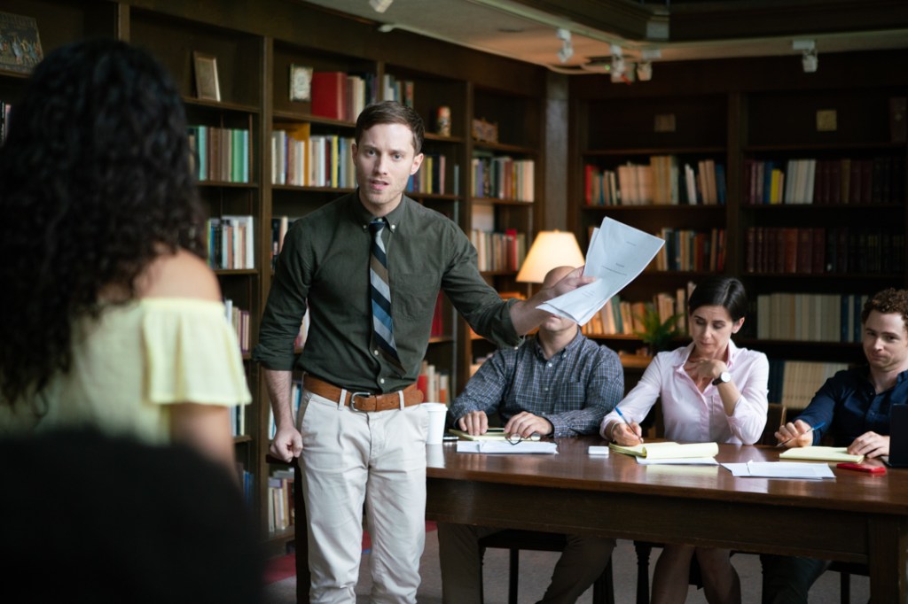 As the film unfolds in the make-shift “courtroom” and adjacent hallway and bathrooms, we start to see that everyone involved is interconnected behind the scenes. There are secrets, espionage, press leaks, blackmail, old grudges and secret plots all going on behind the closed doors. But as the proceedings begin to leak out into the outside world, the participants and the school at large have to confront the racial tensions, power dynamics and systemic biases inherently ingrained in the higher education system. The film also does an excellent job of highlighting the modern-day anxiety and frustrations of a generation currently facing uncertain futures. It speaks to the debate that has been had for decades about the validity and necessity of a liberal arts education, especially in today’s day and age.